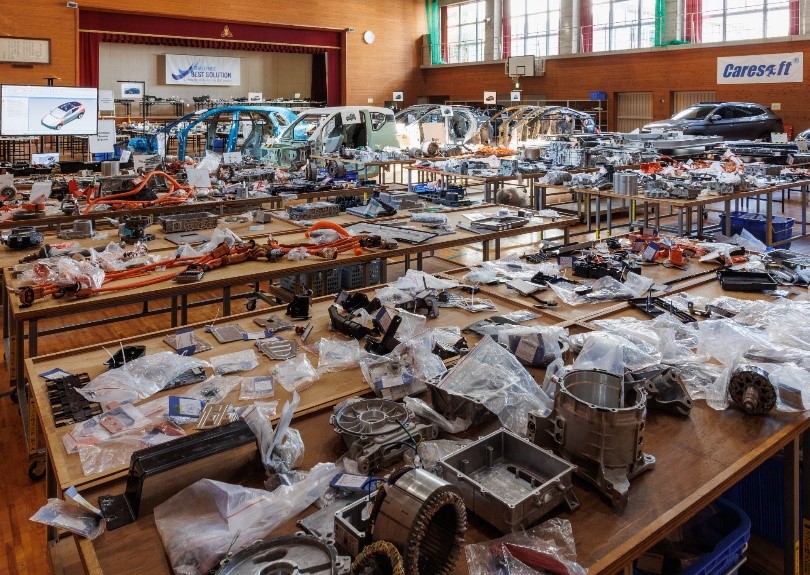 それぞれの車種に搭載されている部品を比較しやすいよう、モーター・インバーターなどのEVパワートレインシステム、バッテリー・空調の温度管理を担うサーマルマネジメントシステム、骨格部品や内外装部材など、部品群ごとにカテゴライズされた展示に変更しています。また、Tesla社や中国メーカーのEVなど、完成車を3台ご用意しております。話題となっている最新EVに試乗し、学校の敷地内を実際に走行していただくことも可能です。