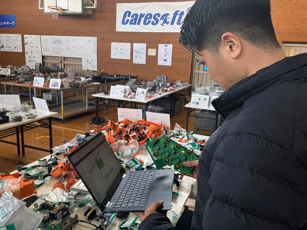 当展示場では、それぞれの車種に搭載されている部品を比較しやすいよう、モーター・インバーターなどのEVパワートレインシステム、バッテリー・空調の温度管理を担うサーマルマネジメントシステム、骨格部品や足回り・内外装部材など、部品群ごとに展示をしています。Caresoftのソリューションで車体に搭載された部品の詳細データを確認し、実物を手に取って比べてみることが可能です。さらに、TeslaやBYDなどの最新EVの完成車5台もご覧いただけます。