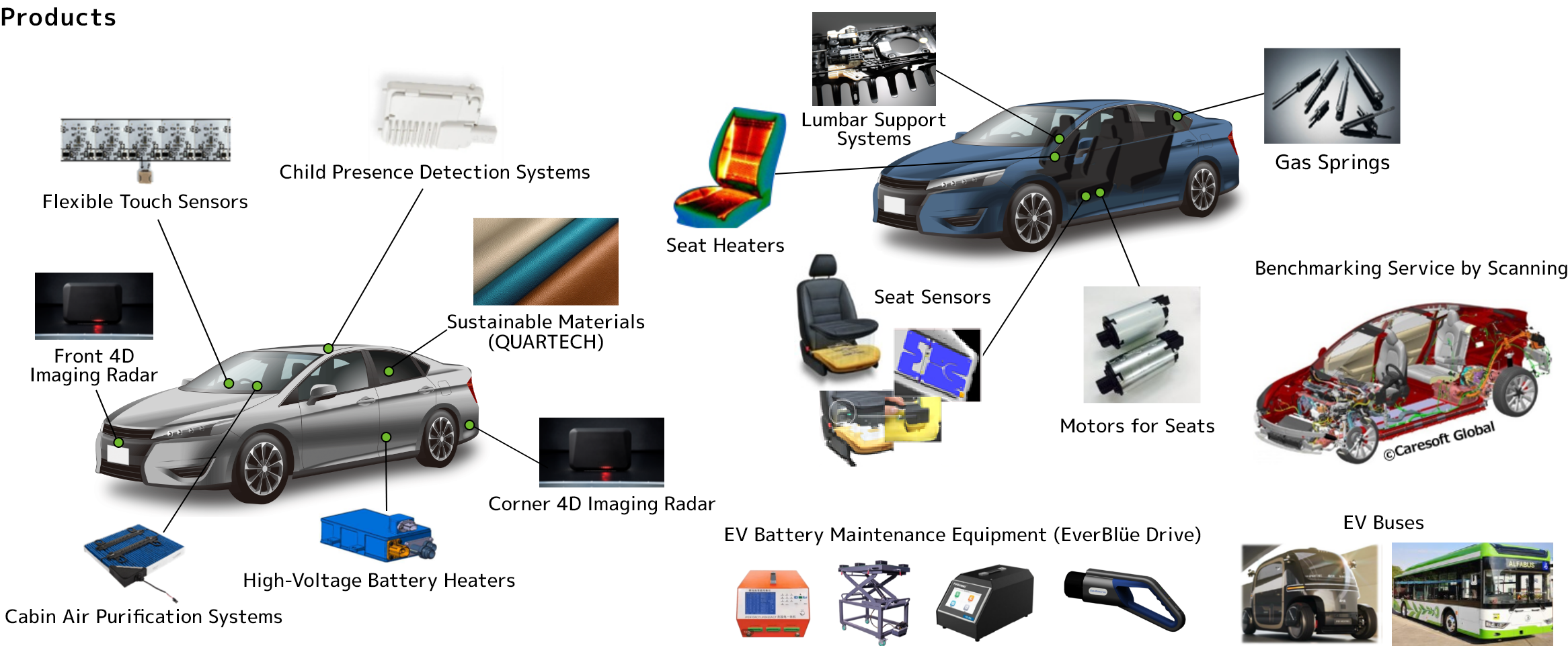 We handle automotive interior materials and high-function parts, including lumbar support systems and seat heaters, and provide consistent support from sales expansion, order receipt to development, launch, mass production management, and replacement parts for old models. We also provide technical sales support for overseas parts manufactures.