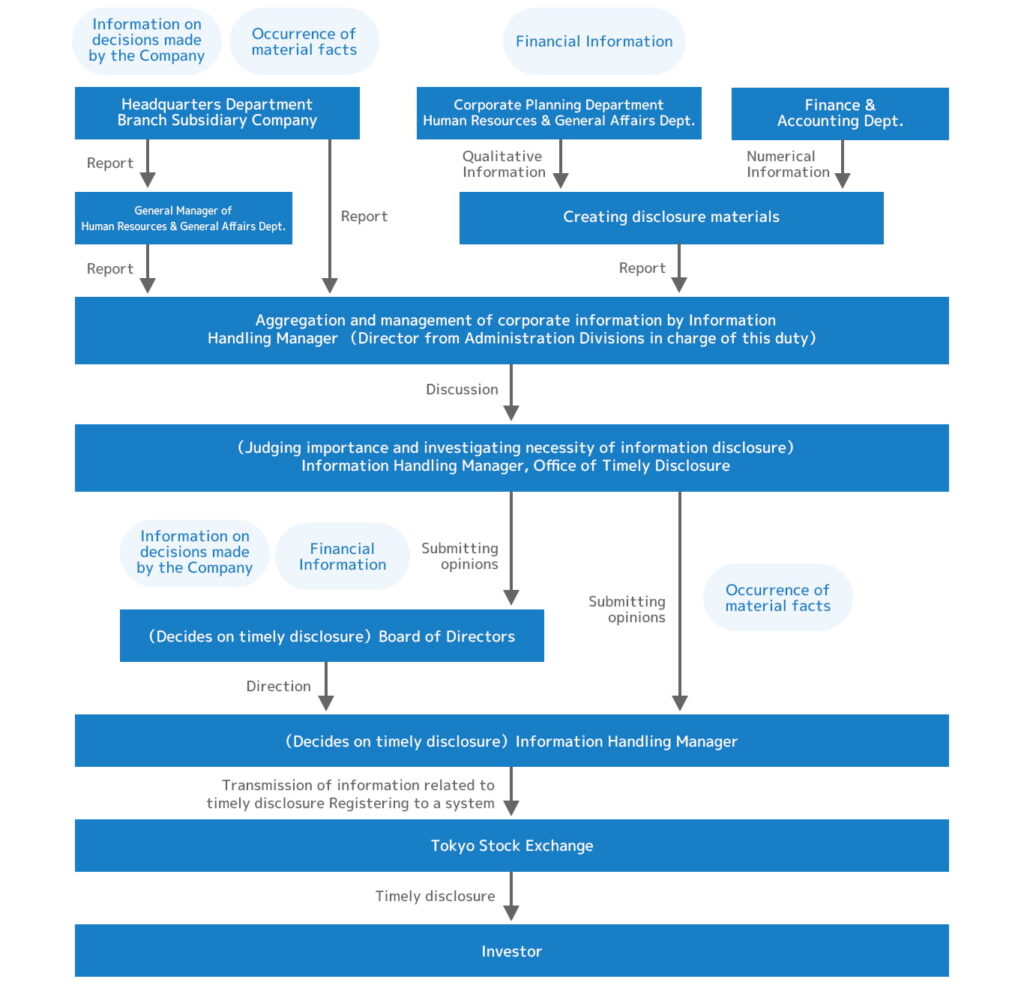For disclosure of the material facts that will affect investment decisions (company decisions, occurrence of facts, and financial statements information), we have established Disclosure Regulations in accordance with laws and regulations such as the Financial Instruments and Exchange Act as well as with the Securities Listing Regulations specified by Tokyo Stock Exchange (hereinafter referred to as the TSE Regulations) so as to disclose such information timely and appropriately.