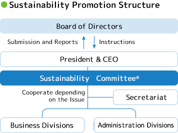 *Committee members (as of October 2025): Executive officer in charge of sustainability (executive officer in charge of Administration Divisions), executive officer in charge of Business Divisions, general managers of General Affairs Dept., Finance & Accounting Dept., IT Solution Dept., and Corporate Strategy Dept. (six members in total).