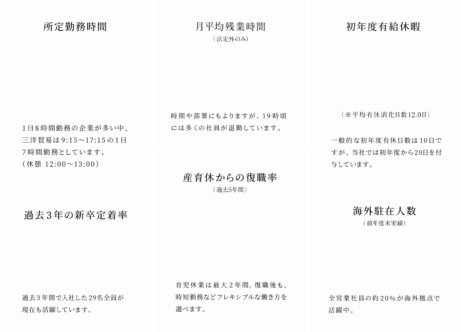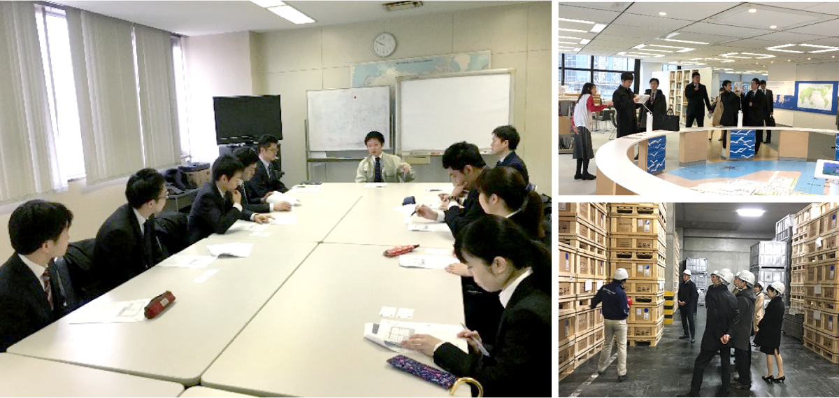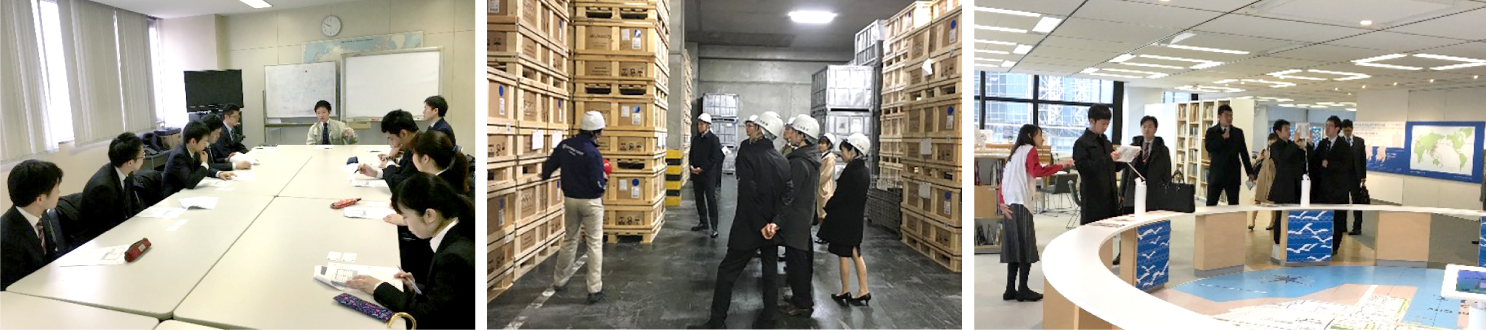 入社後は、社内で各事業部の取引概要の説明や管理部門による基礎知識の研修を行い、新入社員向けの外部研修にも参加します。また、輸出入について理解を深めるために税関や倉庫など貿易の現場で行われる研修にも参加し、総合職は配属前に管理部門にてビジネスの基礎を仕事をしながら学ぶ約2か月の研修期間を設けています。