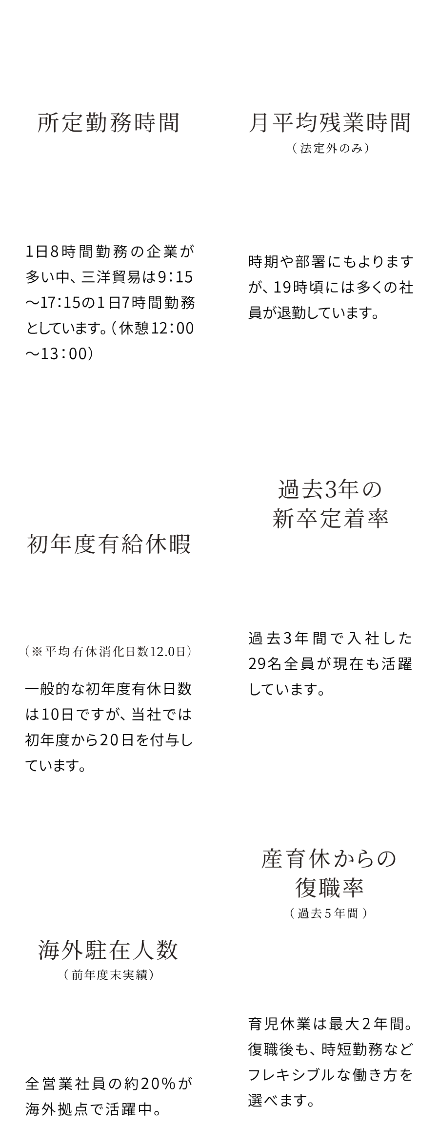 若手総合職を対象に、中国・タイ・ベトナム等の拠点で1年間の派遣型研修を実施。希望者の中から社内公募で選抜しています。派遣中は現地での実務にあたるほか、必要に応じて語学学校への通学など、1年という期間で最大限成長できるように、会社が強力にバックアップします。